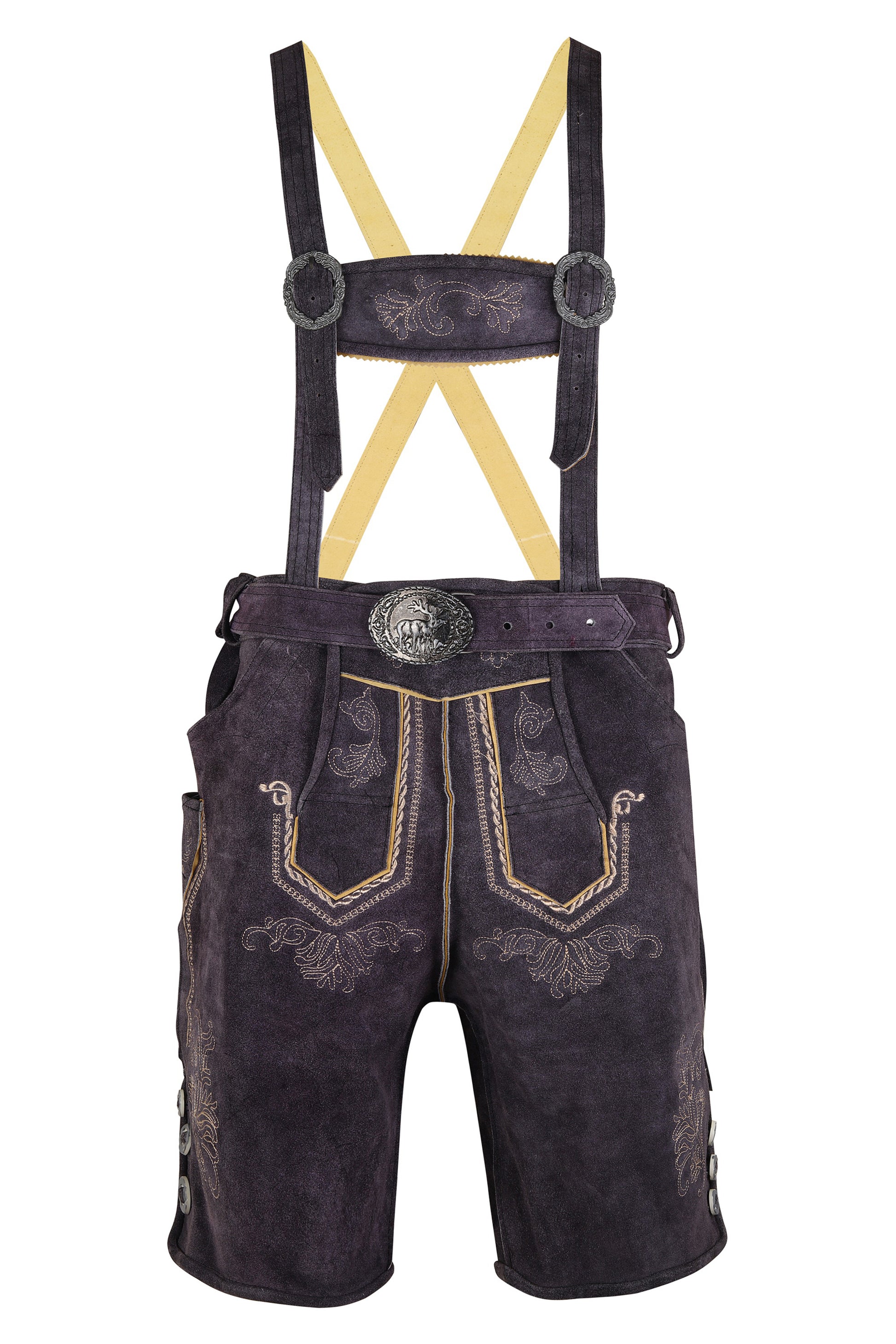 Bring authentic Bavarian tradition to life with these premium lederhosen, crafted from 100% genuine cow leather in a stylish dark grey finish. Featuring classic embroidery, decorative horn-style buttons, a matching leather belt with ornate buckle, and suspenders, these lederhosen offer both comfort and durability.