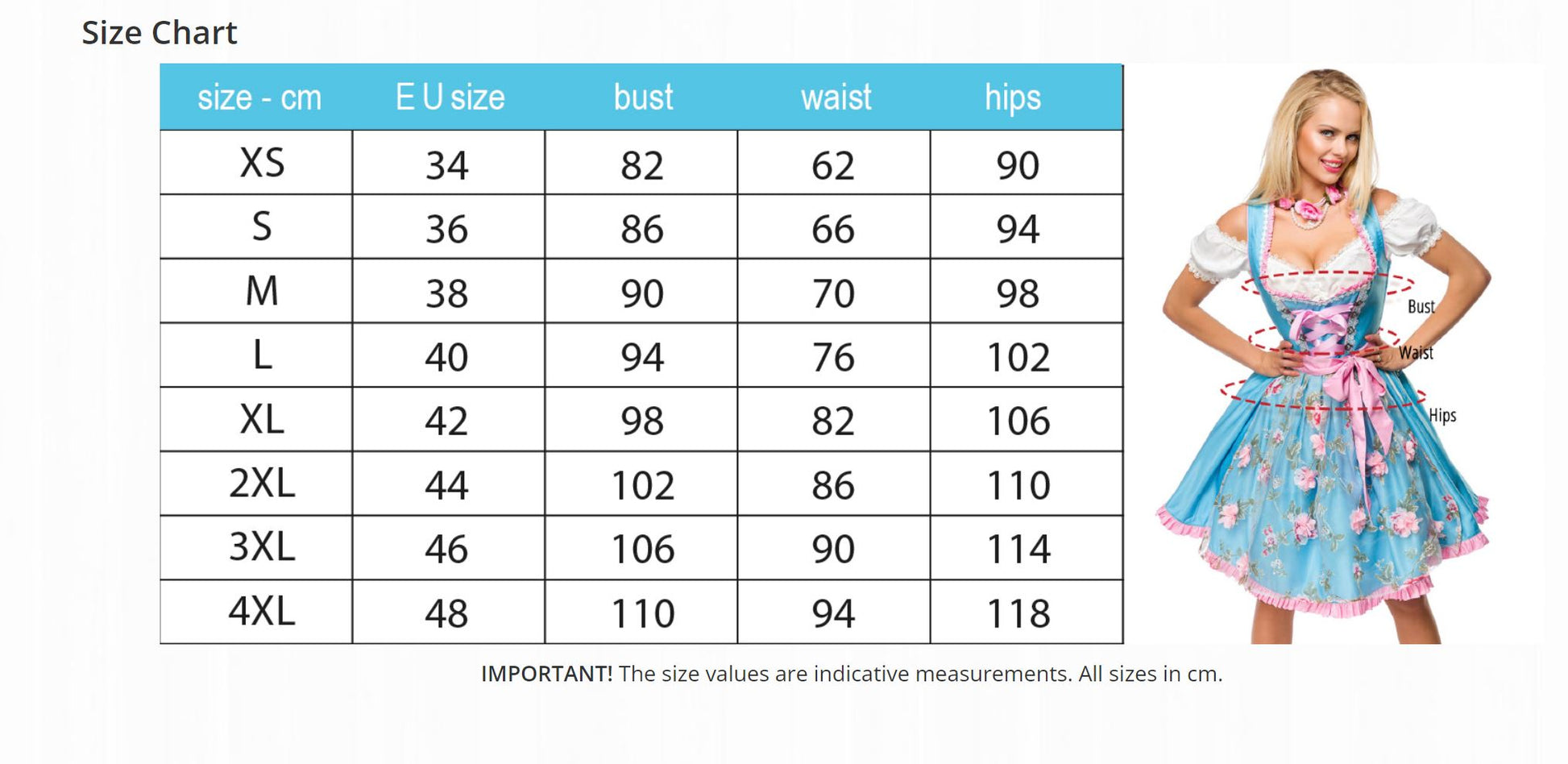 Celebrate in true Bavarian style with the Dirndl “Alpenrose Festlich”. This 3-piece set includes a cotton–polyester dress with embroidery, a detachable red satin apron, and a classic white blouse. The green ribbon lacing adds a charming contrast, while the lace-trimmed hem completes the traditional look.