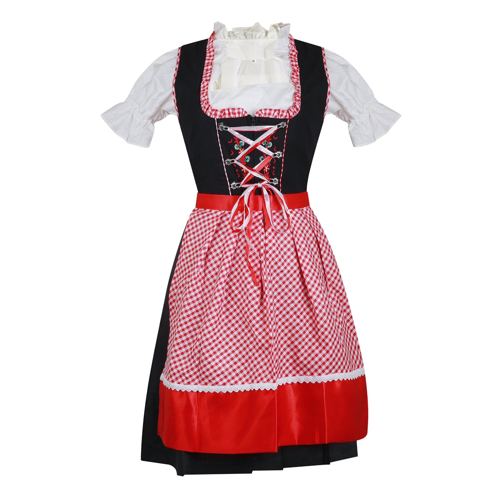 The Dirndl “Bavaria Rot” is a festive and authentic Bavarian dress, designed for Oktoberfest and cultural celebrations. Made from a cotton–polyester blend, it features a black dress with embroidered bodice, traditional red gingham accents, and a detachable red satin apron. The included white puff-sleeve blouse completes the look, making it a full outfit ready for any festival.